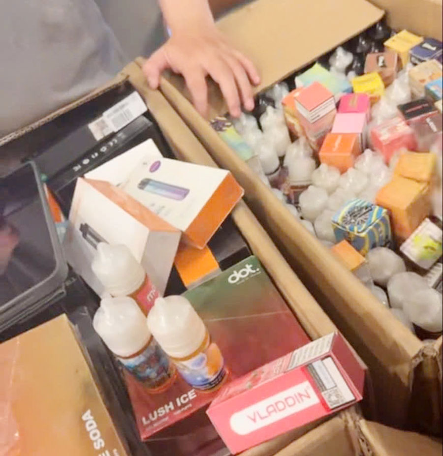 Tại hiện trường và các kho liên quan, lực lượng chức năng thu giữ 28.657 sản phẩm gồm máy hút thuốc lá điện tử, tinh dầu, linh kiện và nicotine đóng trong 140 thùng carton. Cơ quan chức năng ước tính tổng giá trị hàng hóa vi phạm hơn 4,8 tỷ đồng.